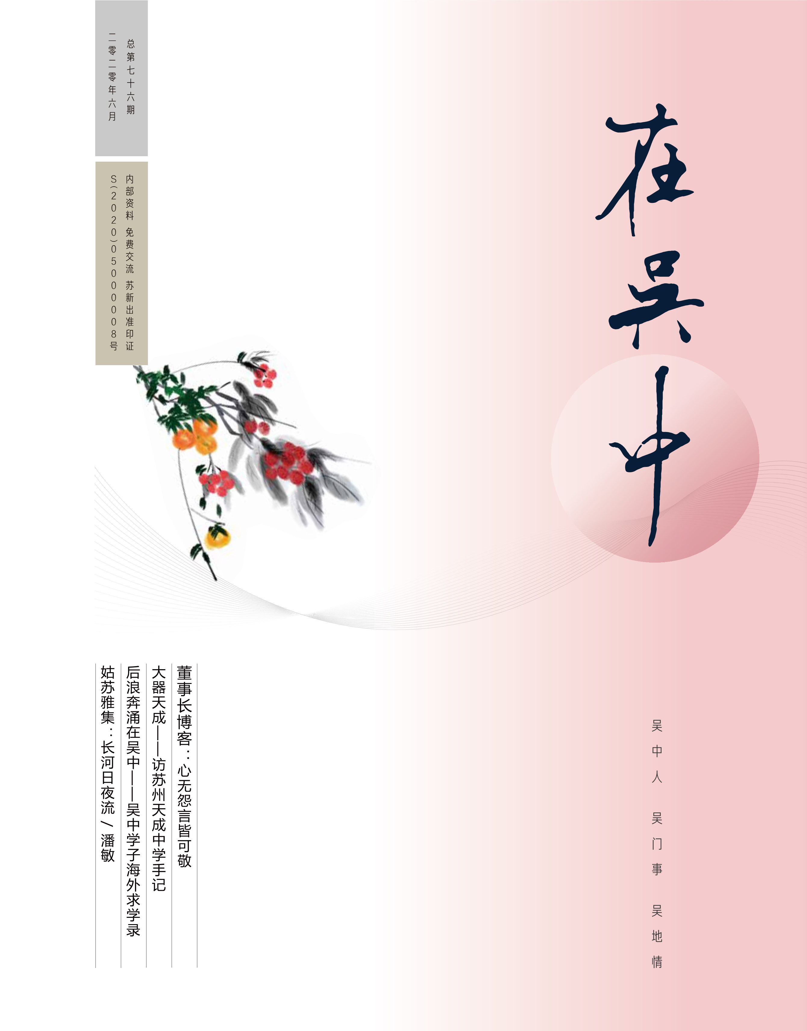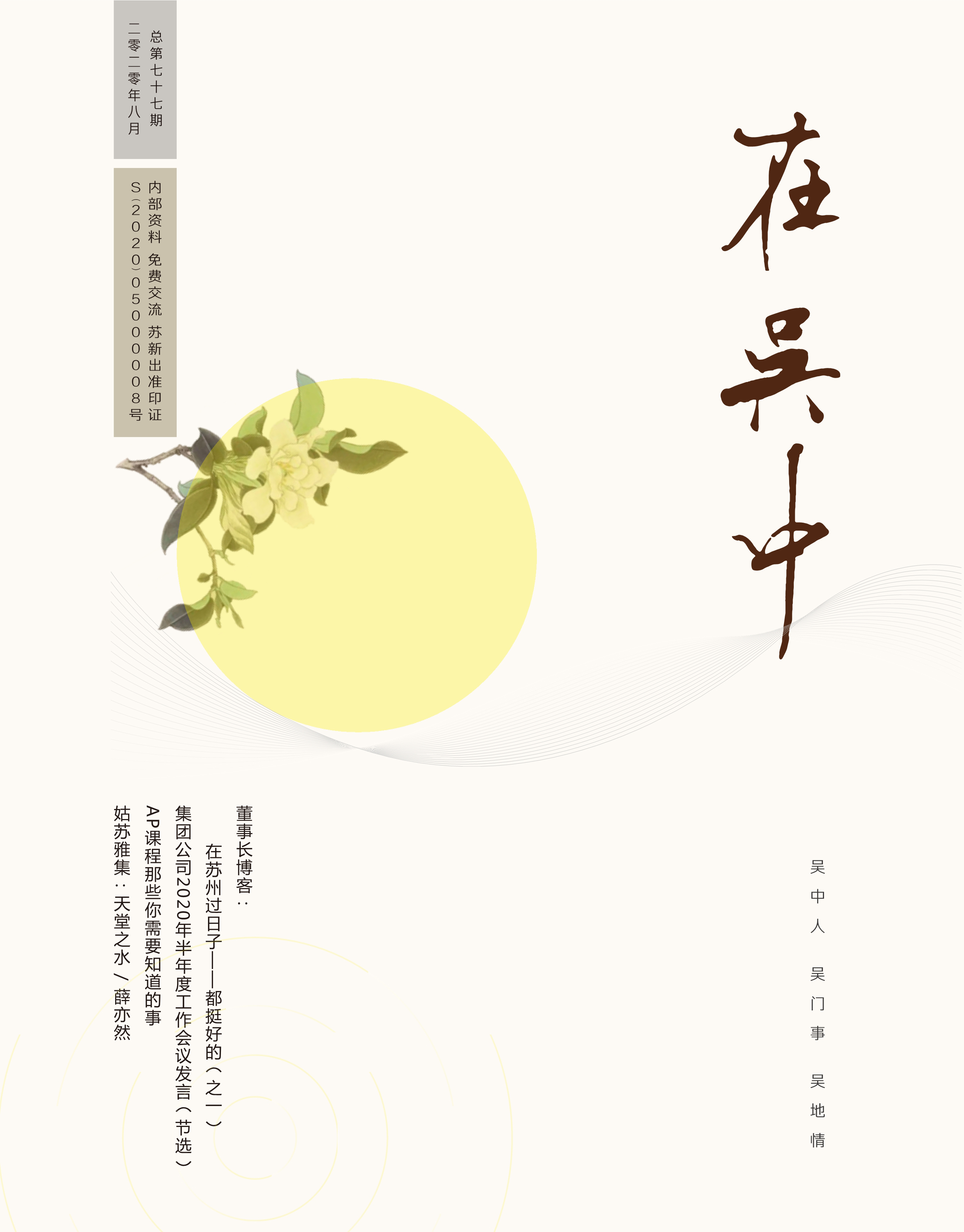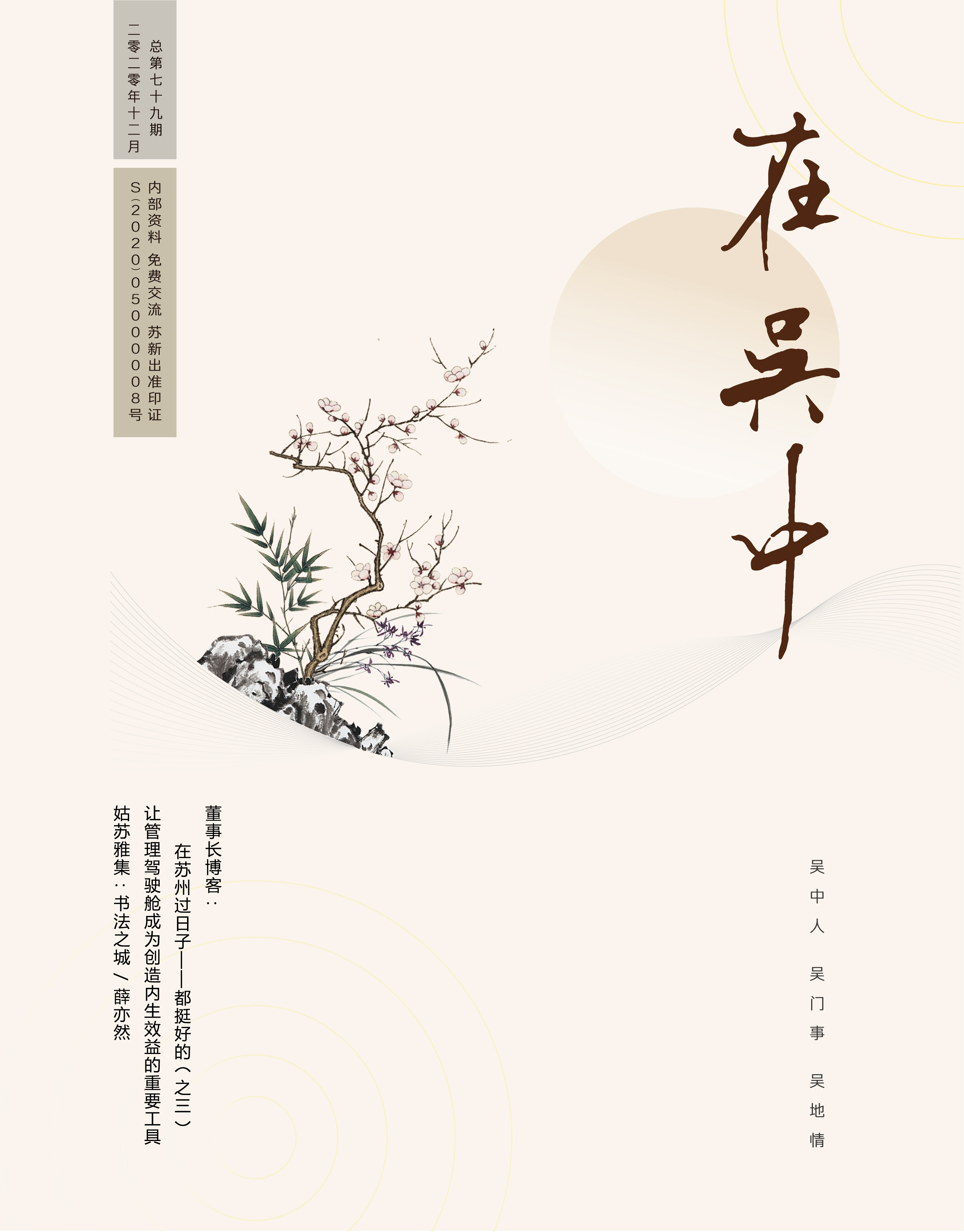 《在吳中》創(chuàng)刊于2005年,蘇州市十佳內(nèi)刊。以述吳中人、記吳中事、傳吳中情為宗旨,堅持記錄吳中集團的發(fā)展,為品牌建設(shè)發(fā)展助力?!对趨侵小穯纹谟∷?500冊,主要用以企業(yè)內(nèi)部交流,其意在傳達的吳中集團的力量、文化和精神。每期《在吳中》都記載著吳中人工作、學(xué)習(xí)、生活的實時動態(tài),所見所聞、所思所想、所作所為,總結(jié)借鑒企業(yè)經(jīng)營管理之道,汲取吳地人文精髓,廣受社會各界的好評和認(rèn)可。