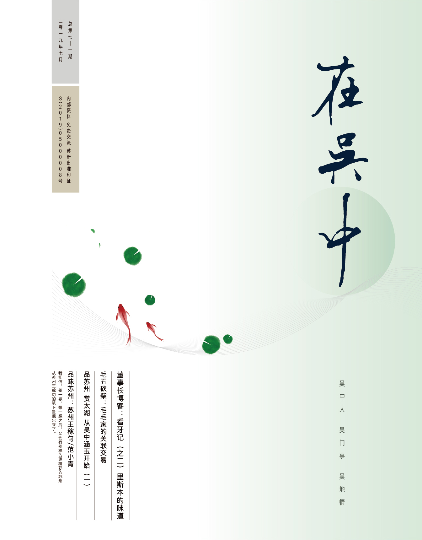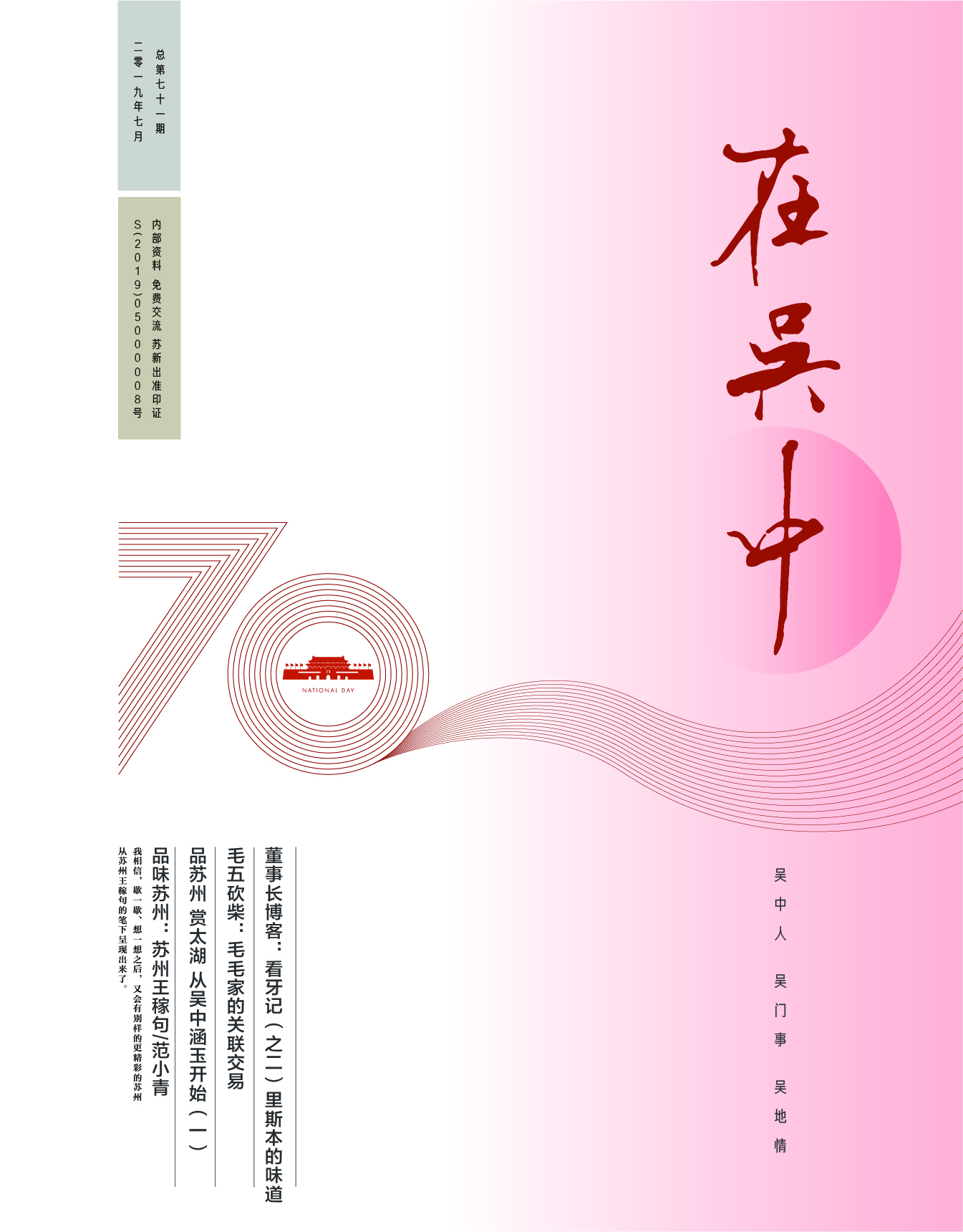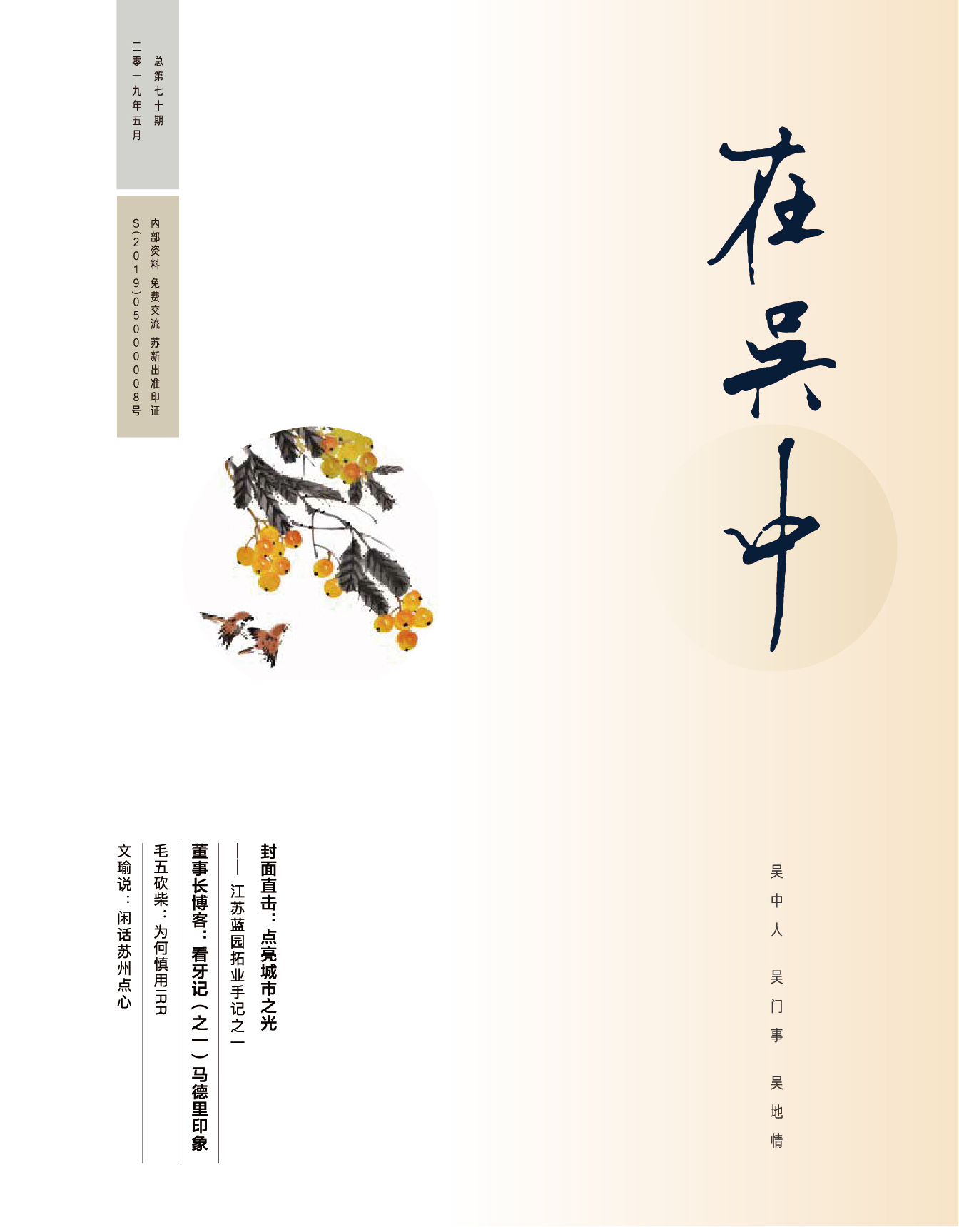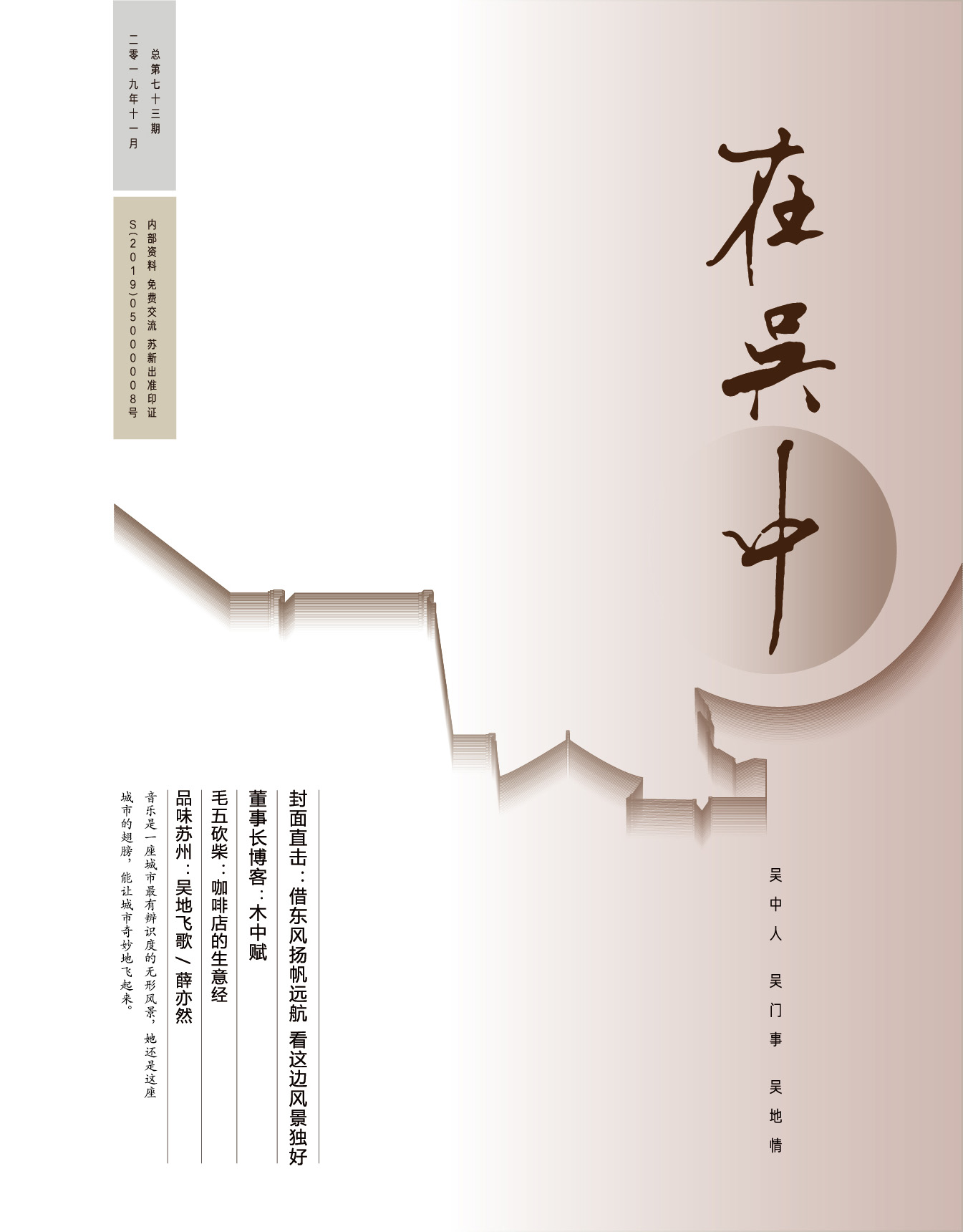 《在吳中》創(chuàng)刊于2005年,蘇州市十佳內(nèi)刊。以述吳中人、記吳中事、傳吳中情為宗旨,堅持記錄吳中集團的發(fā)展,為品牌建設(shè)發(fā)展助力?!对趨侵小穯纹谟∷?500冊,主要用以企業(yè)內(nèi)部交流,其意在傳達的吳中集團的力量、文化和精神。每期《在吳中》都記載著吳中人工作、學(xué)習(xí)、生活的實時動態(tài),所見所聞、所思所想、所作所為,總結(jié)借鑒企業(yè)經(jīng)營管理之道,汲取吳地人文精髓,廣受社會各界的好評和認(rèn)可。